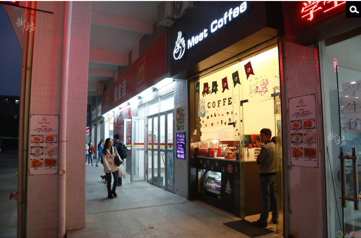 开店前为了考察市场,三人还特意去广州大学城转了一圈。“大学城里的店铺结构其实跟五邑大学差不多,洗衣房啊小卖店之类的。本来我们想开一家奶茶店的,但饭堂内已经有一家了,就改成开咖啡店了”,廉明说。12月11日晚上11点,廉明和陶宛军在收拾店内的东西。